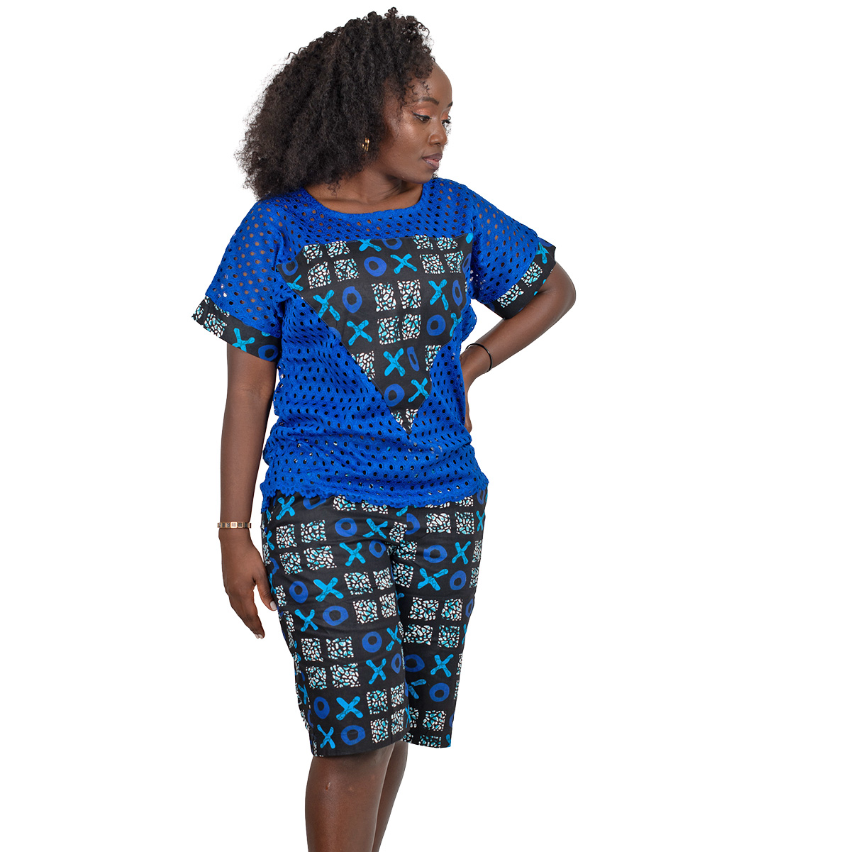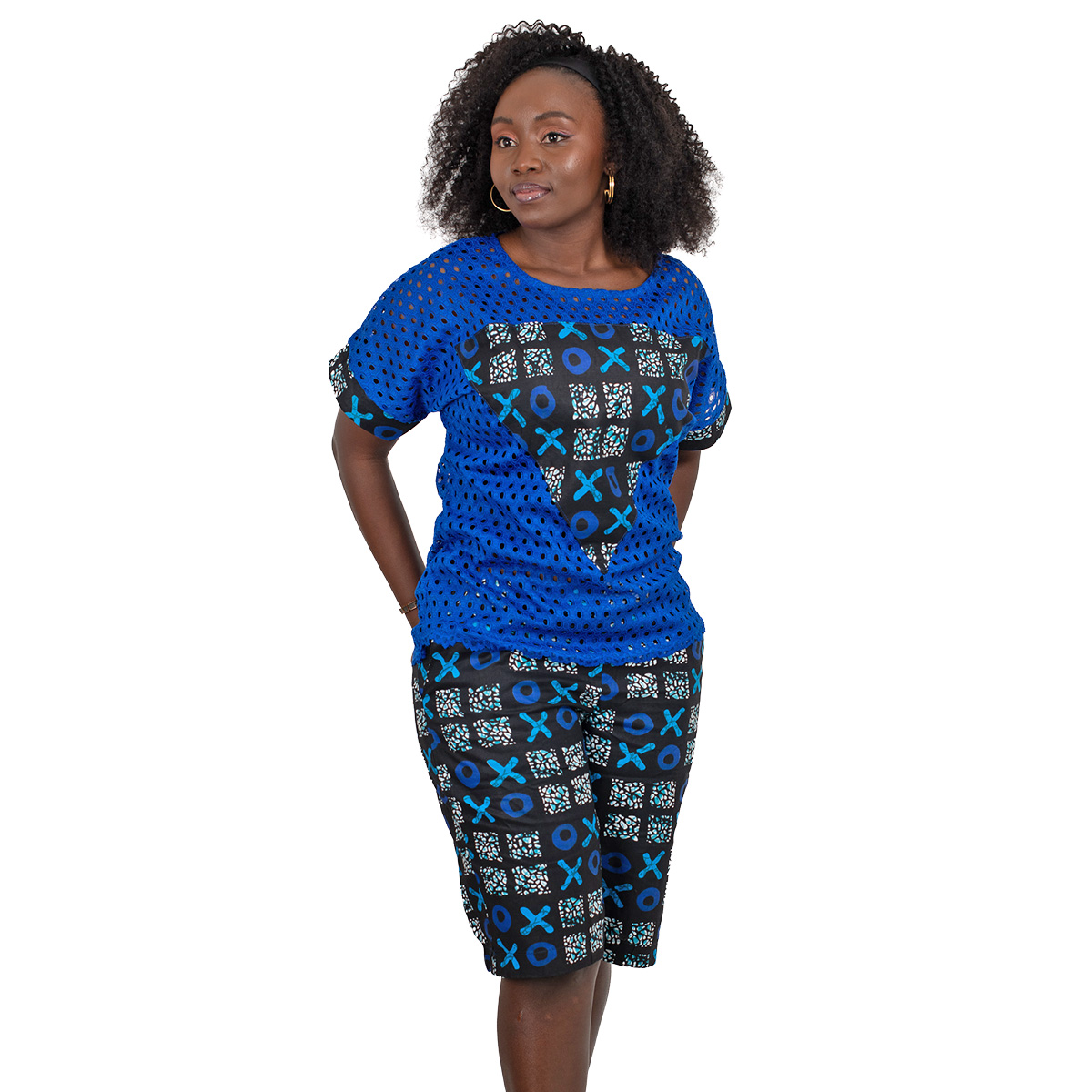 Two-piece set in cobalt blue mesh and geometric Ankara. Round neck top with Ankara trim and matching knicker shorts with side pockets. Refined athleisure.