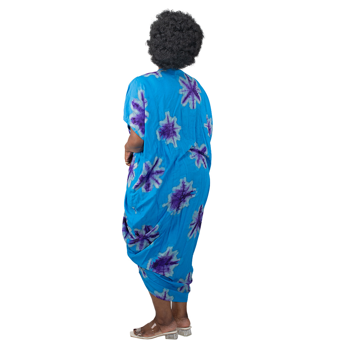 The fabric is soft African cotton with an artisan tie-dye pattern in cerulean blue, purple and white. Each piece is uniquely patterned due to the hand-dyed process.