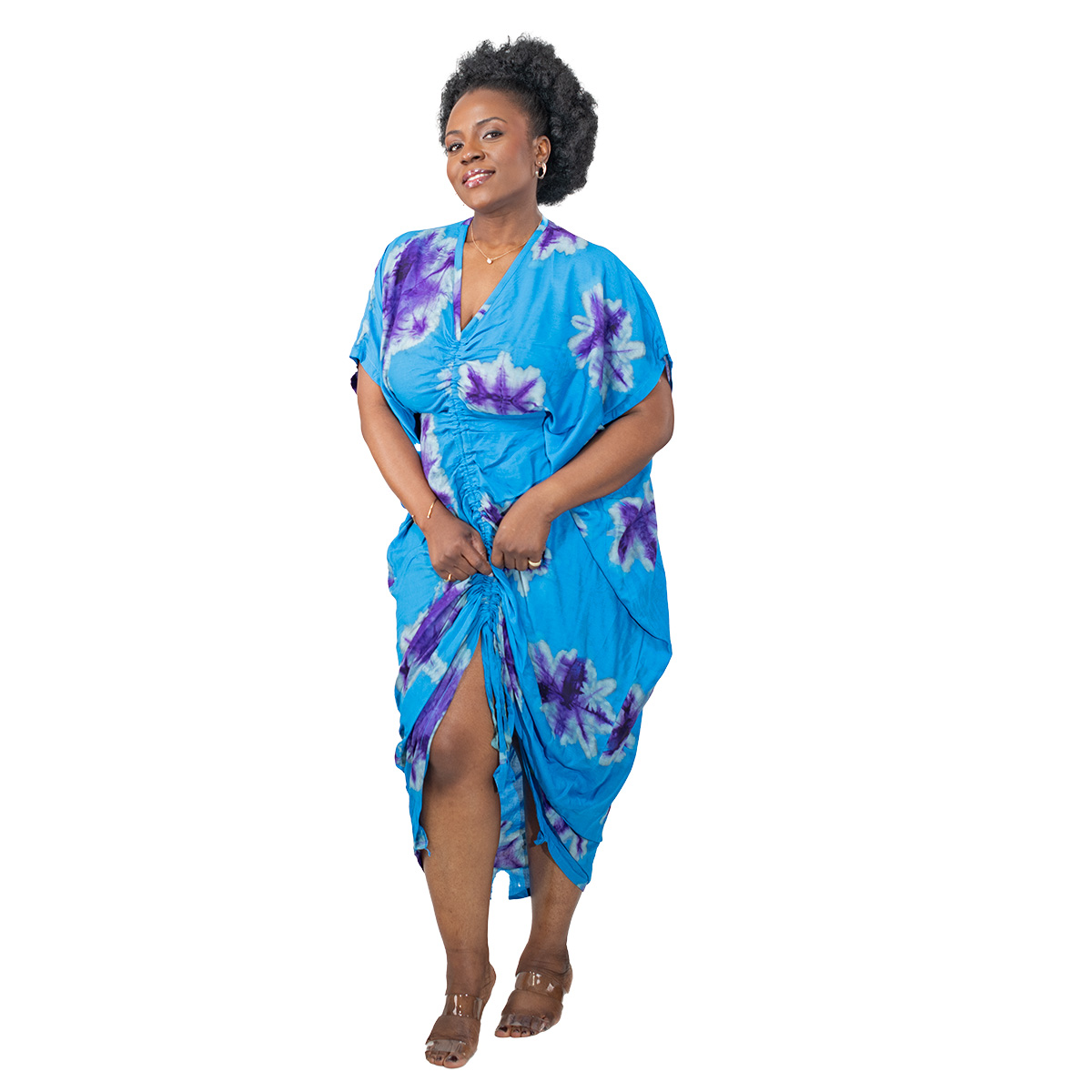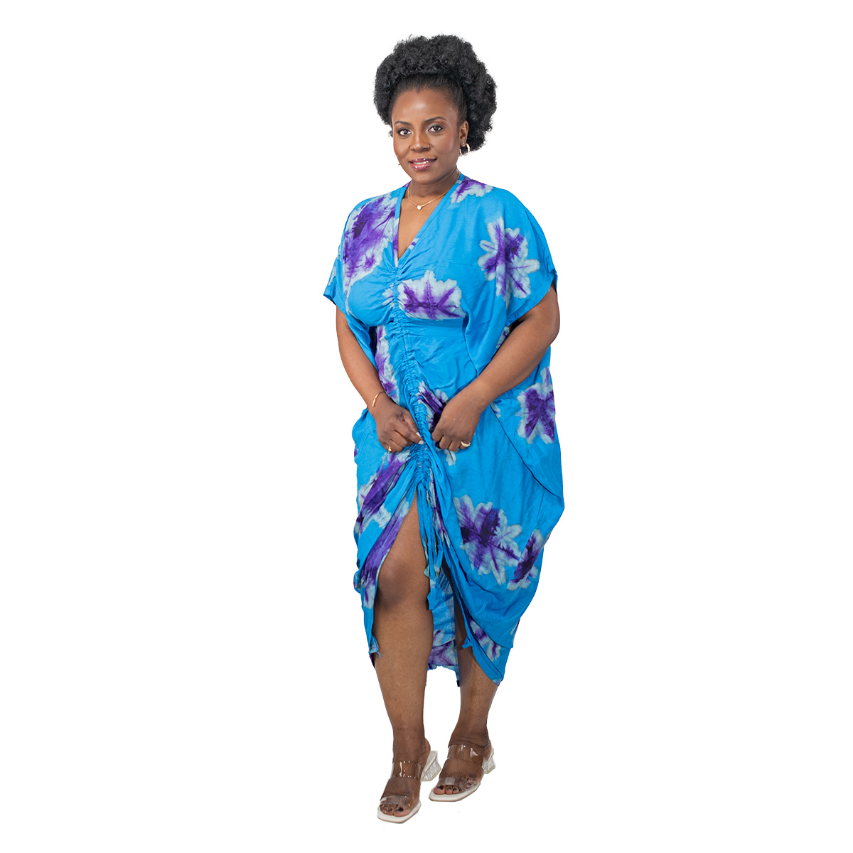 This kaftan offers adjustable styling through dual drawstring closures. The front drawstring gathers the length, while the inner drawstring cinches the waist for a defined silhouette. The deep V-neckline and short sleeves frame the upper body.