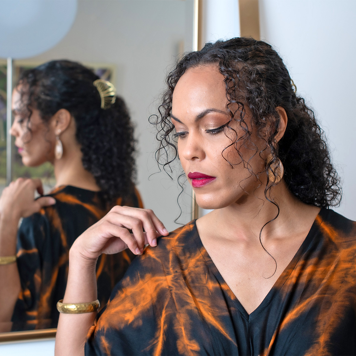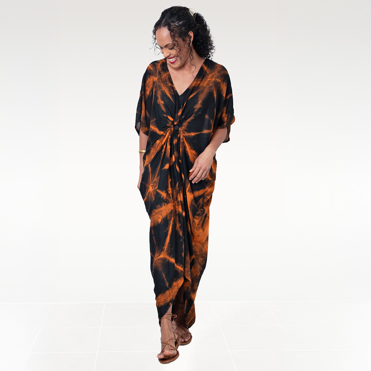 Striking burnt orange tie-dye on deep black. Handcrafted African cotton with a knotted waist for effortless drama. Limited edition.