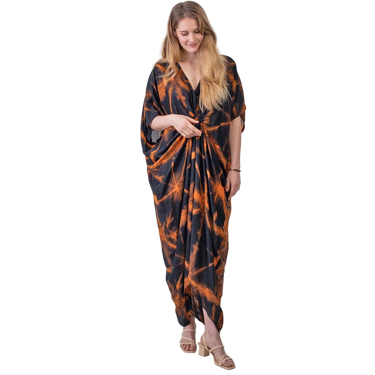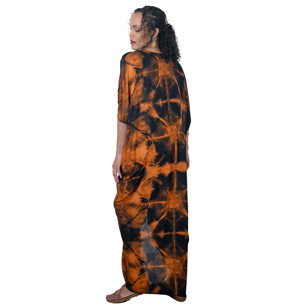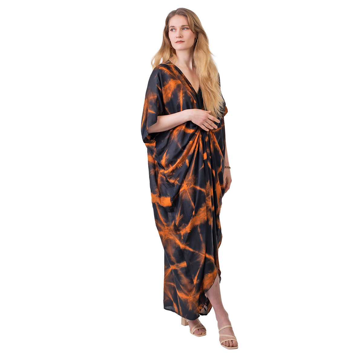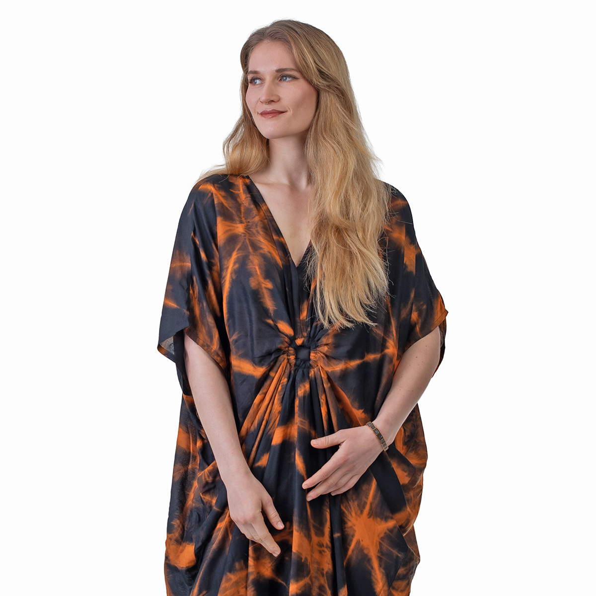 This kaftan is handcrafted from soft African cotton with a dramatic tie-dye pattern in burnt orange on deep black. Each piece is uniquely patterned.