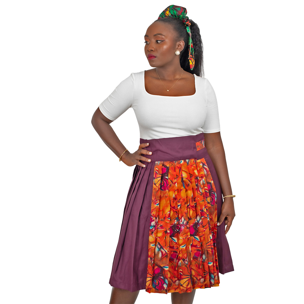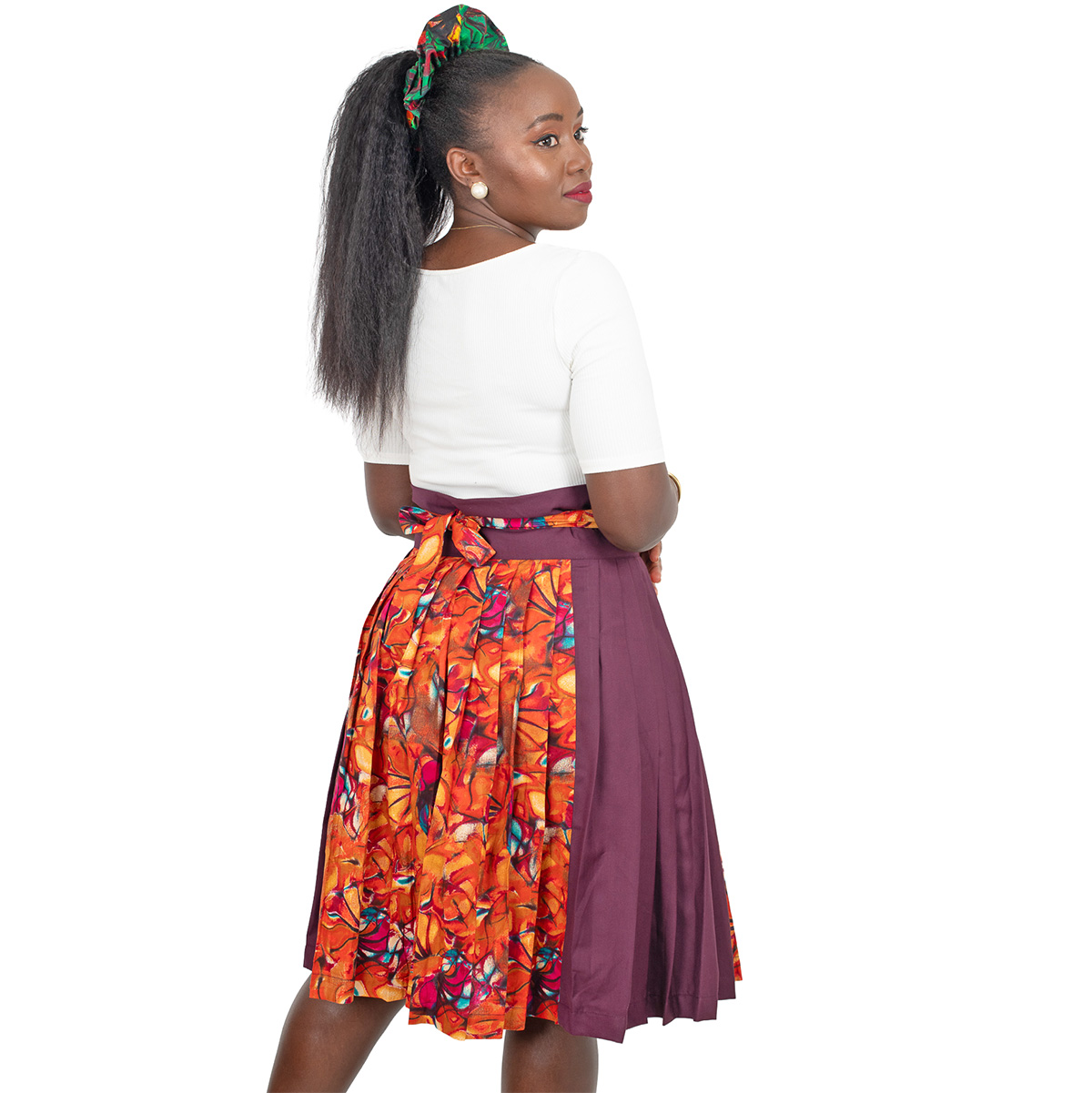This wrap skirt is handcrafted by combining two premium fabrics: vibrant red and orange floral African wax print (Ankara) paired with a deep burgundy solid. The split design creates bold visual contrast while the solid panel adds sophistication and versatility.