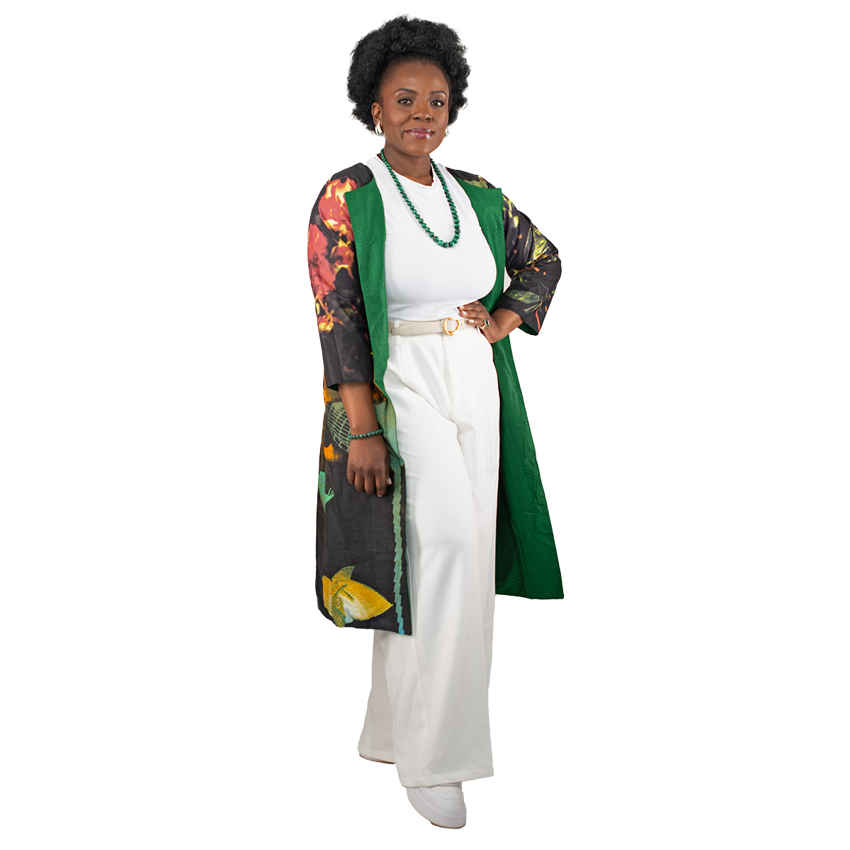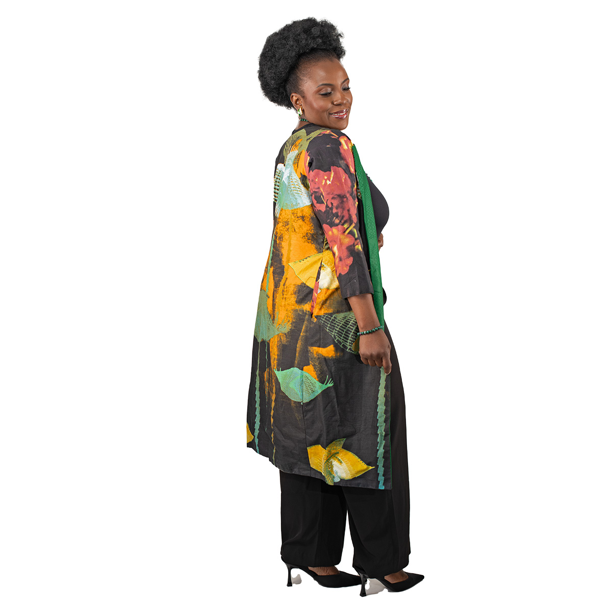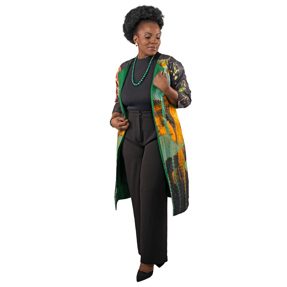 The midi-length silhouette falls at knee with 3/4 sleeves and open front design that allows for fluid movement and layering versatility. Pockets add function. Wear the abstract side out for bold color or flip to the emerald green for rich sophistication.