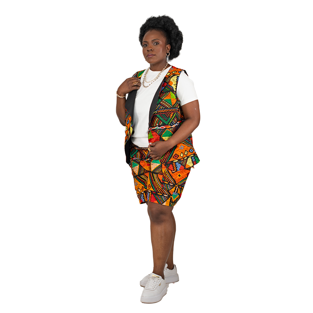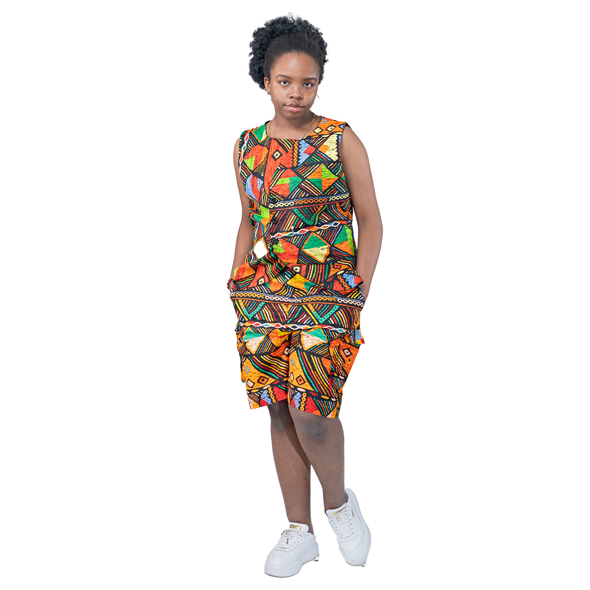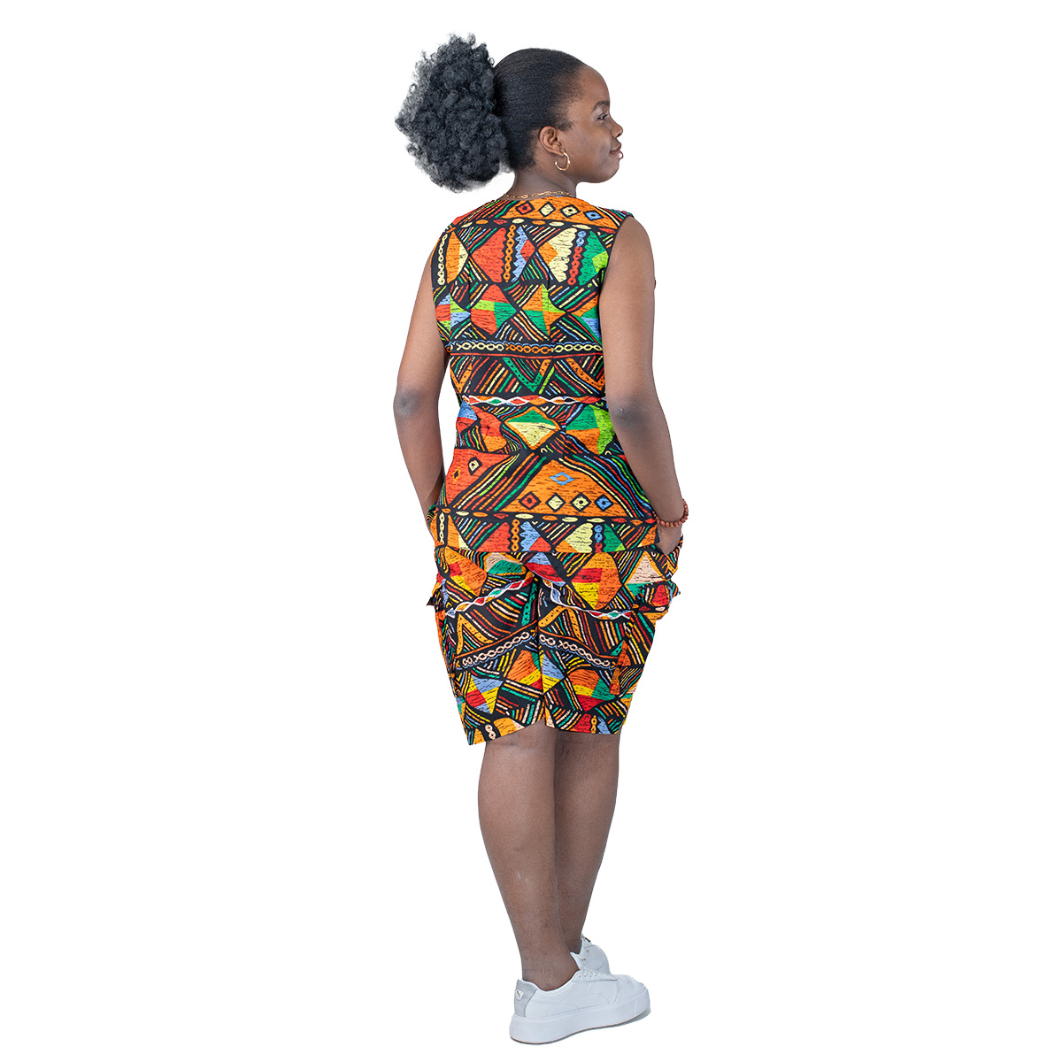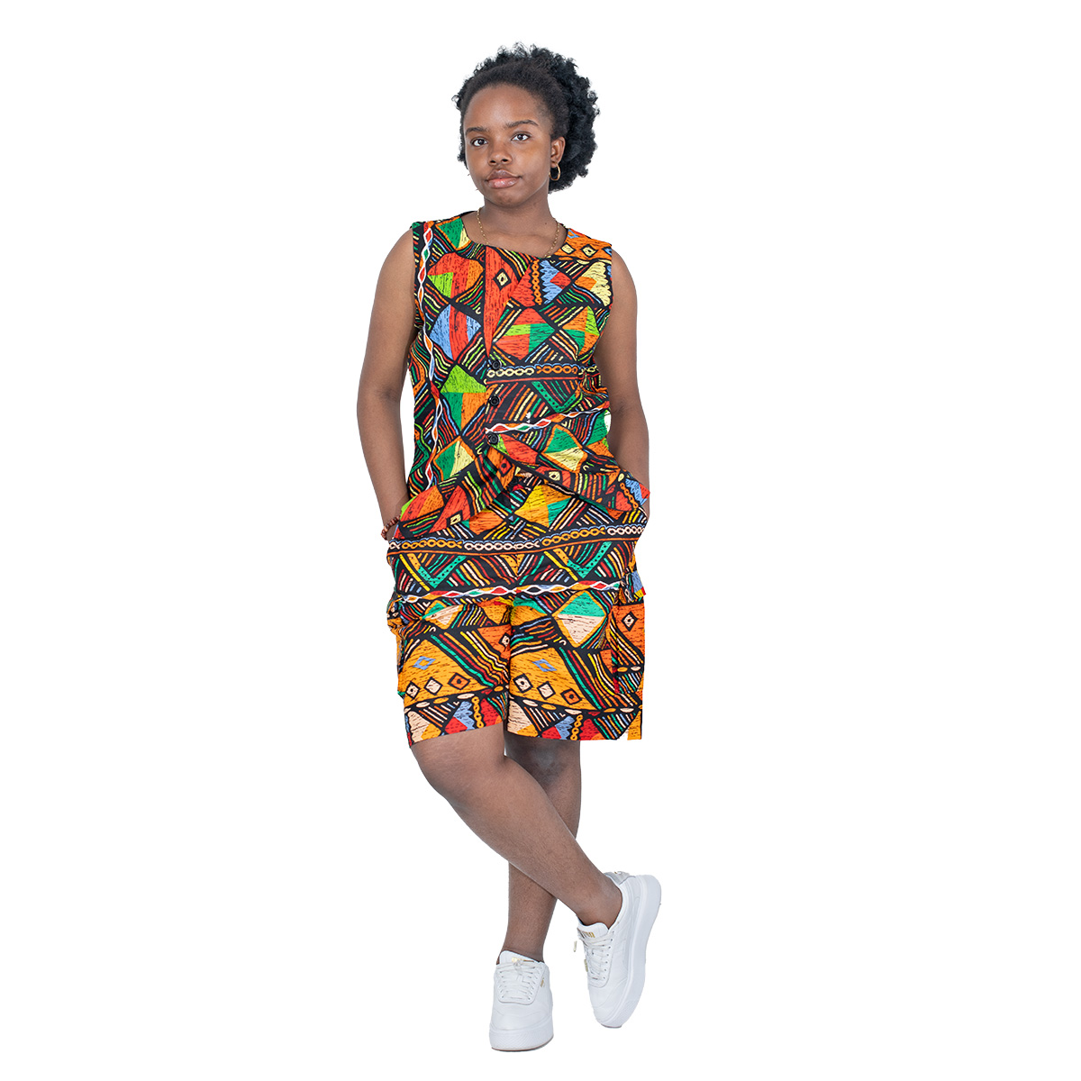 Two-piece matching set in vibrant geometric Ankara. Sleeveless crossover top with button closure and knee-length cargo shorts. Wear together or separately. Available in sizes S-XL.