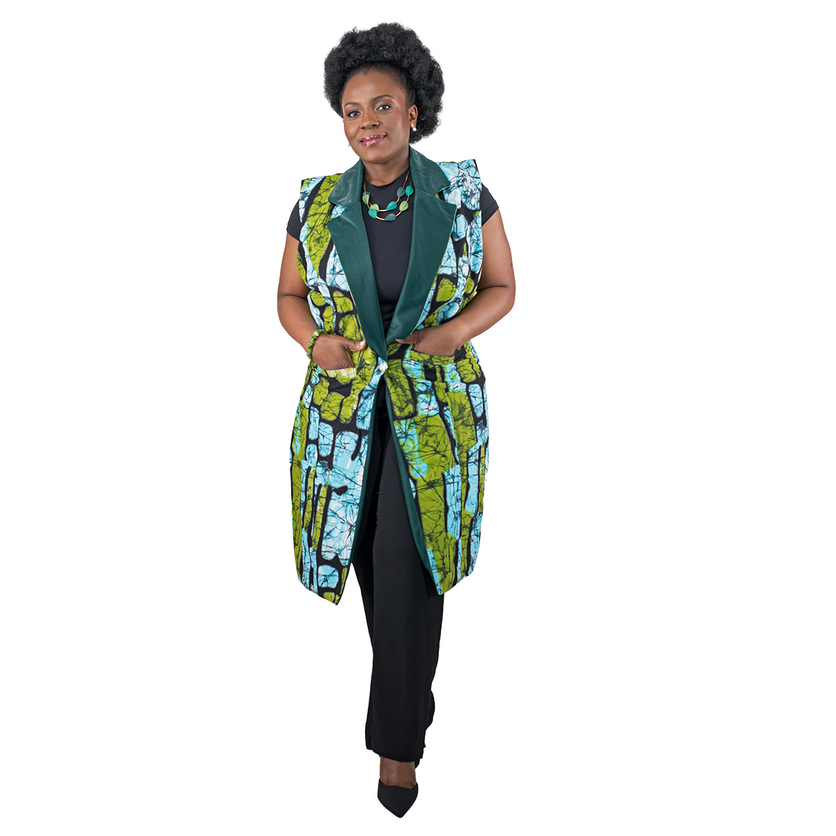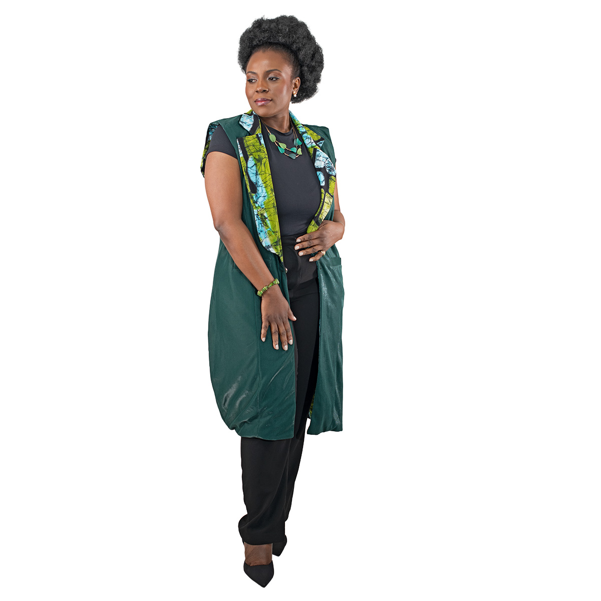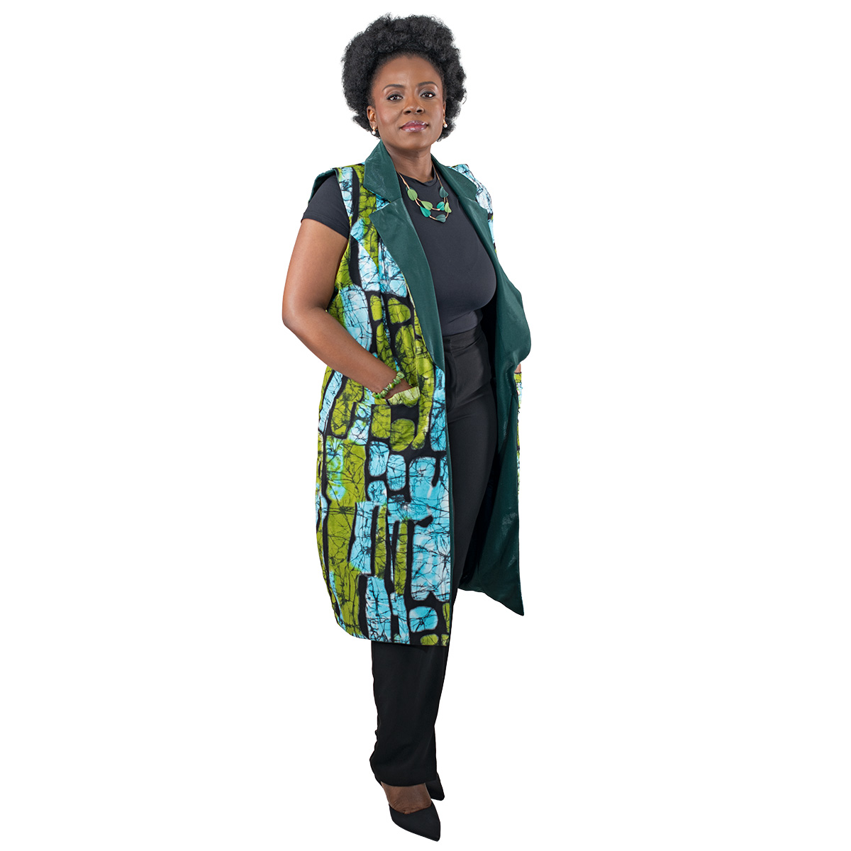 The midi-length silhouette falls at mid-thigh to knee with a wide lapel collar that frames the neckline. Open front design allows for fluid movement and layering versatility. Two front pockets add function. Wear the green side out for polished sophistication or flip to the Ankara for bold color.