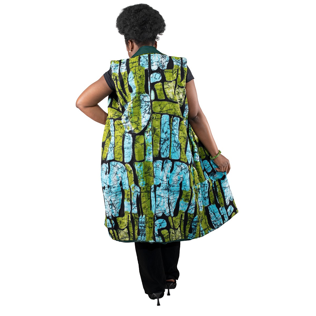 Reversible midi-length gilet in forest green suiting fabric and lime-turquoise abstract crackle Ankara. Wide lapel collar, open front, two pockets. Wear both ways for versatile styling. One of a kind.