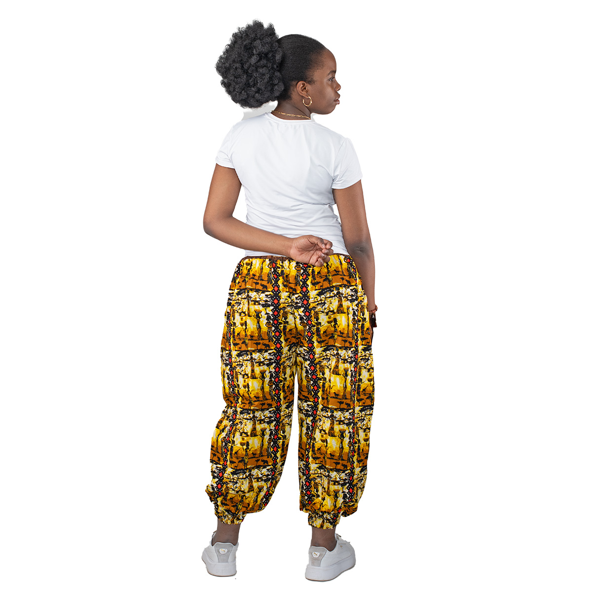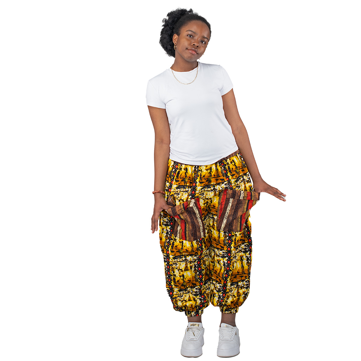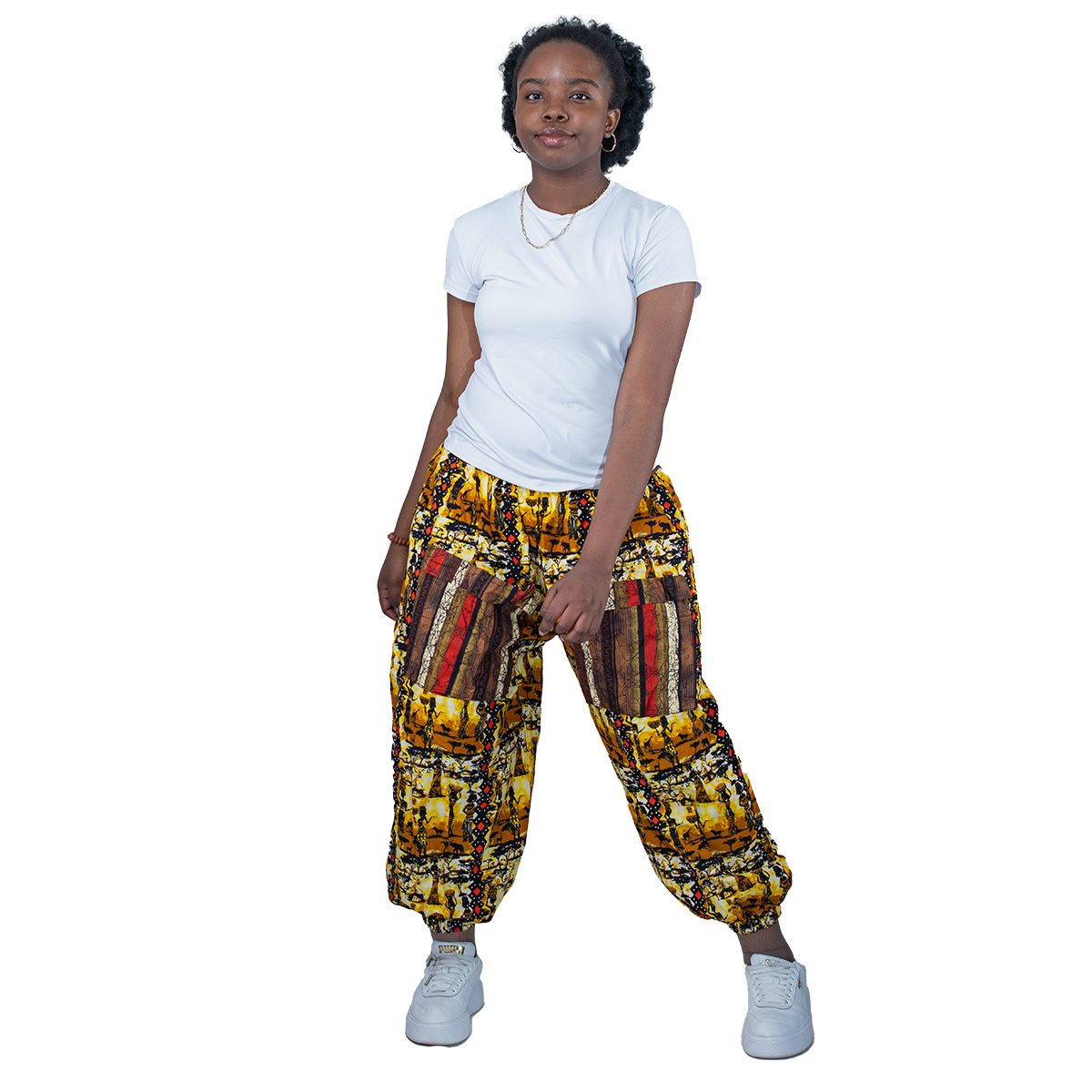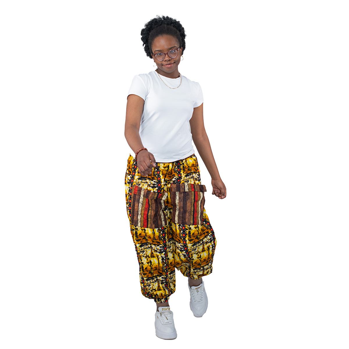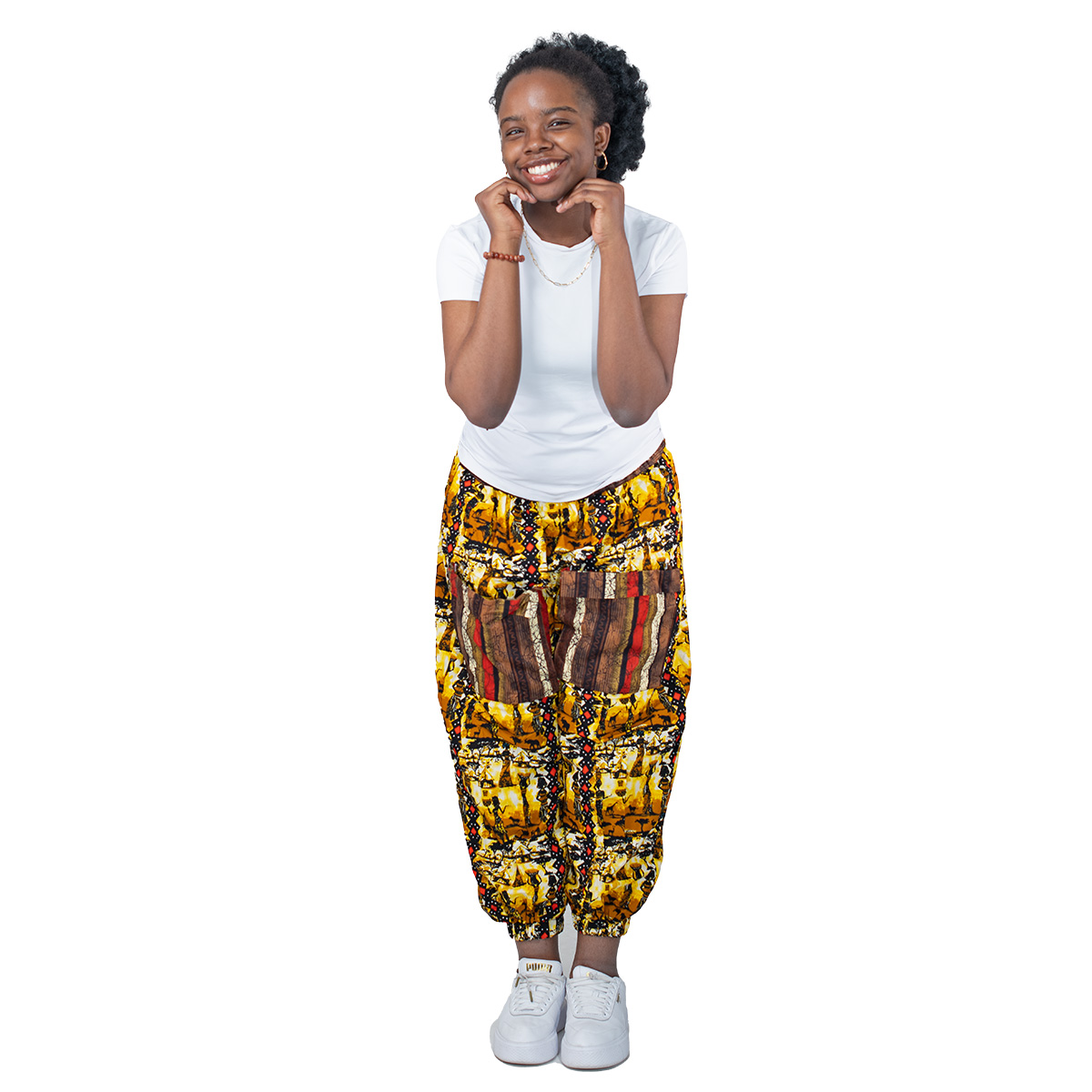 These relaxed fit trousers are cut with ease through the leg and gather at the ankle with an elasticated hem. Two large front patch pockets in contrasting Ankara fabric are a design feature in their own right, with two additional side pockets for function.