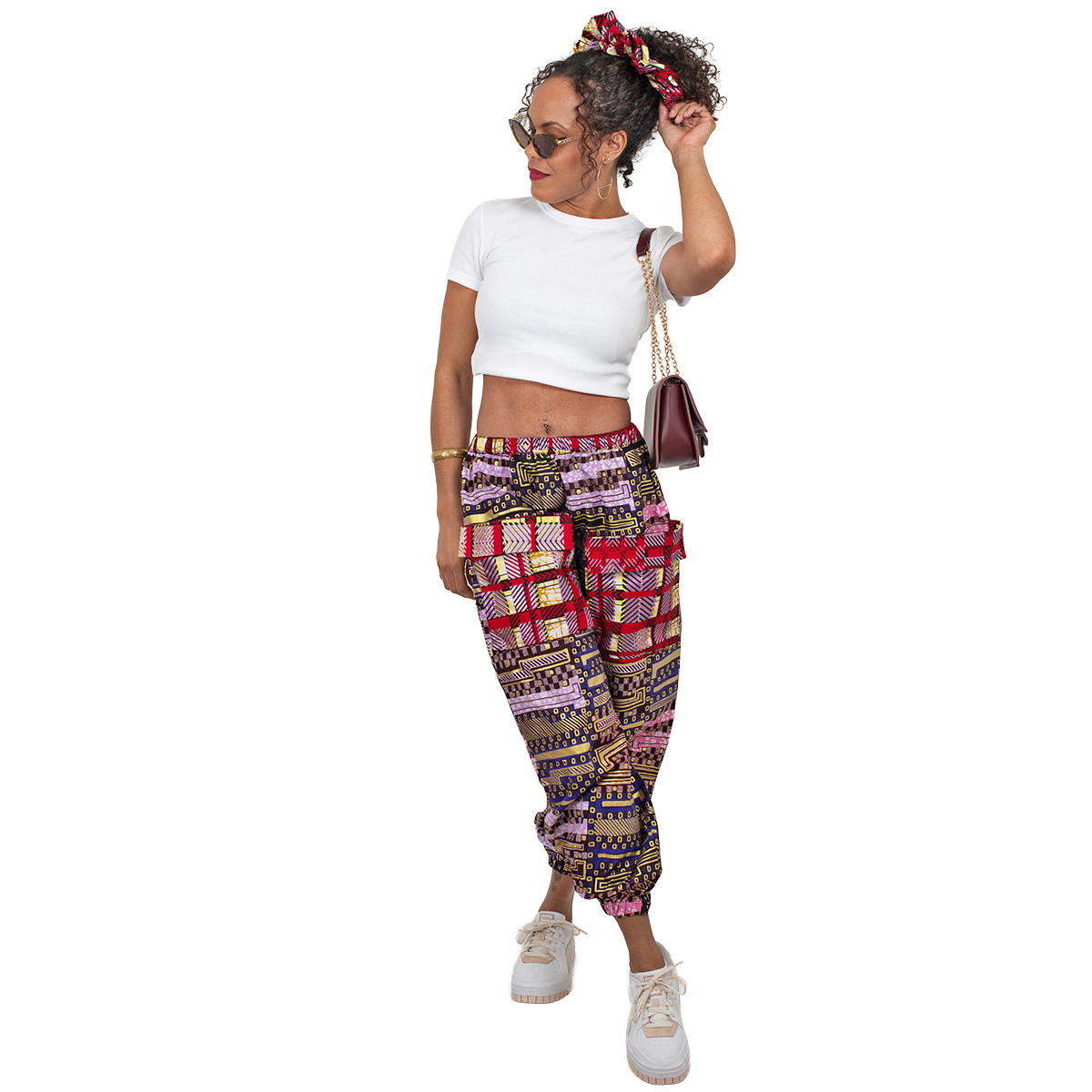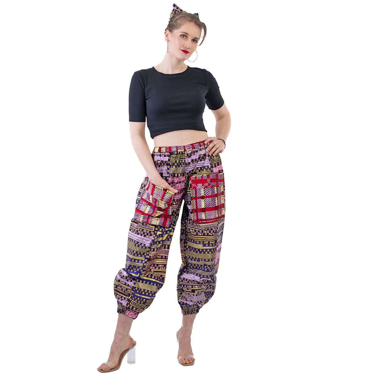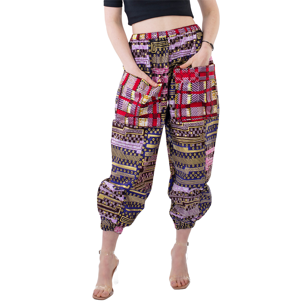 These trousers are handcrafted from premium African wax print (Ankara) featuring a vibrant patchwork design with metallic accents in red, purple, yellow, and green. The horizontal banded pattern creates bold visual impact, and each piece is unique.