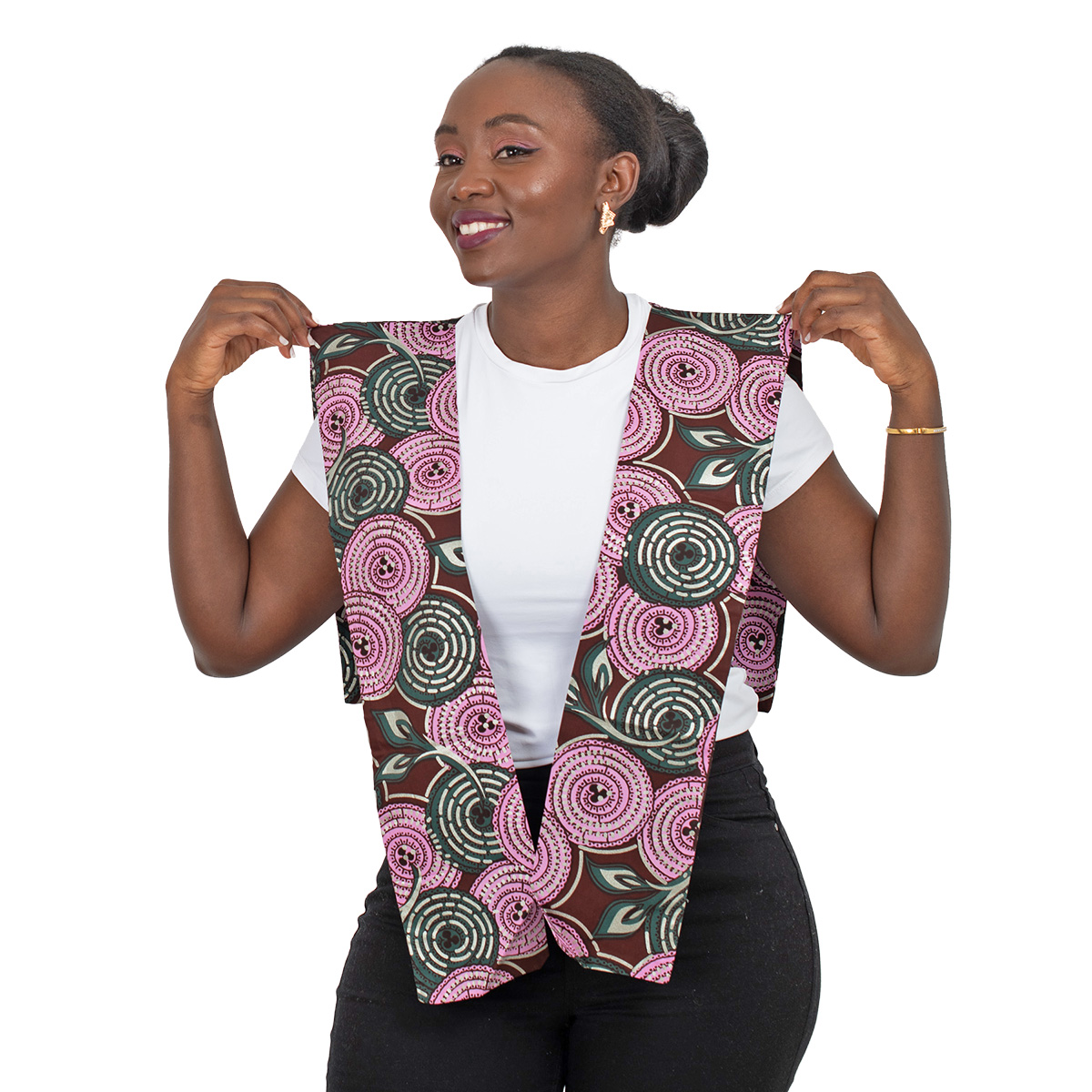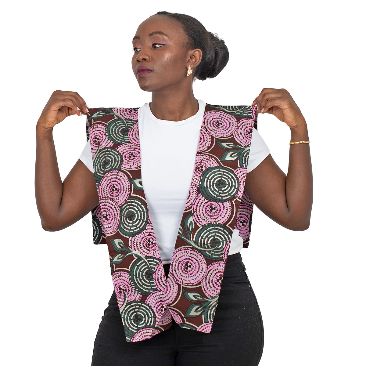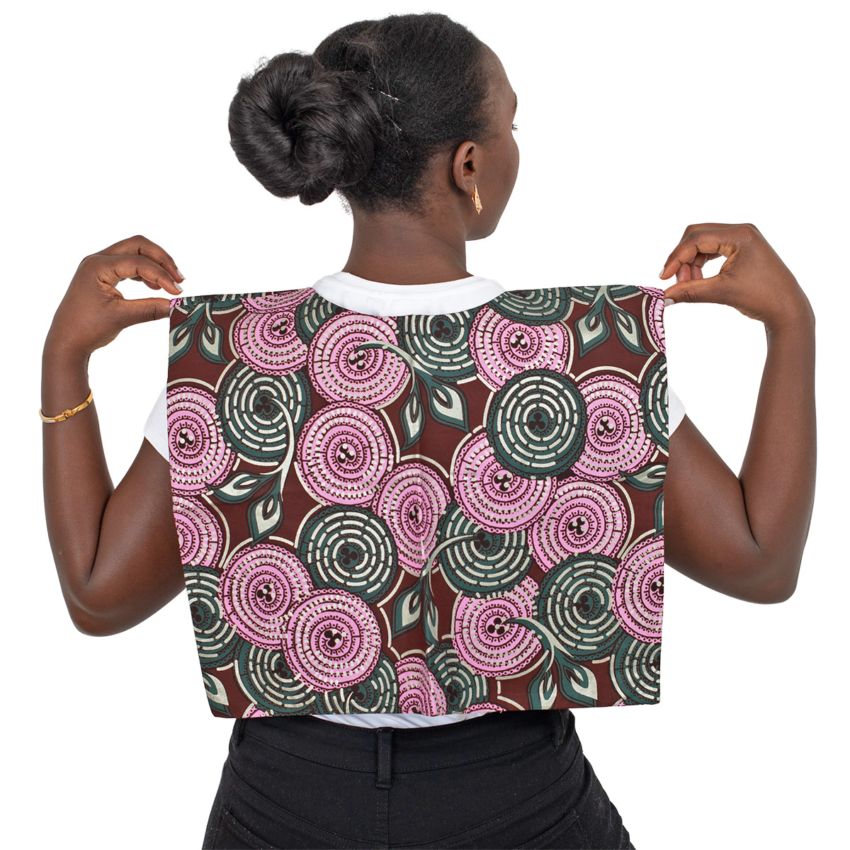 This shoulder cape is handcrafted from premium African wax print (Ankara) featuring the same distinctive circular pattern as the Violetta dungarees. The structured silhouette sits perfectly across the shoulders.