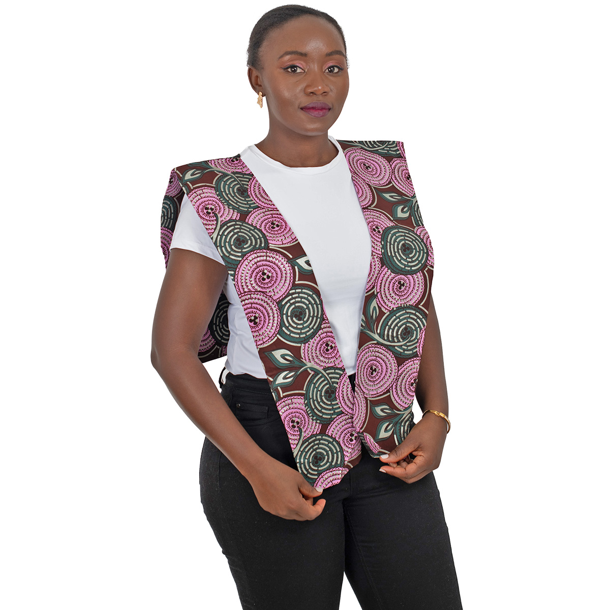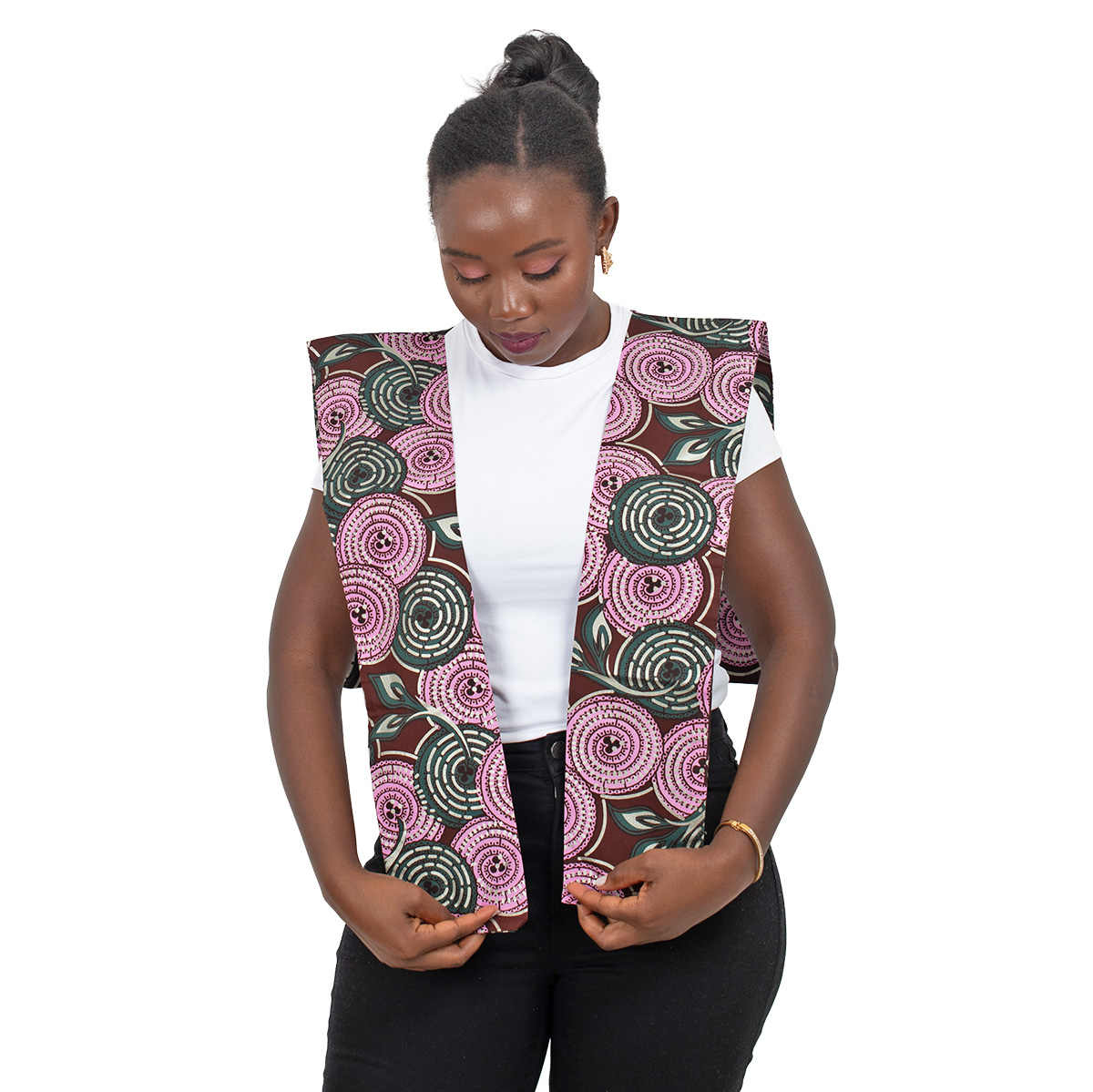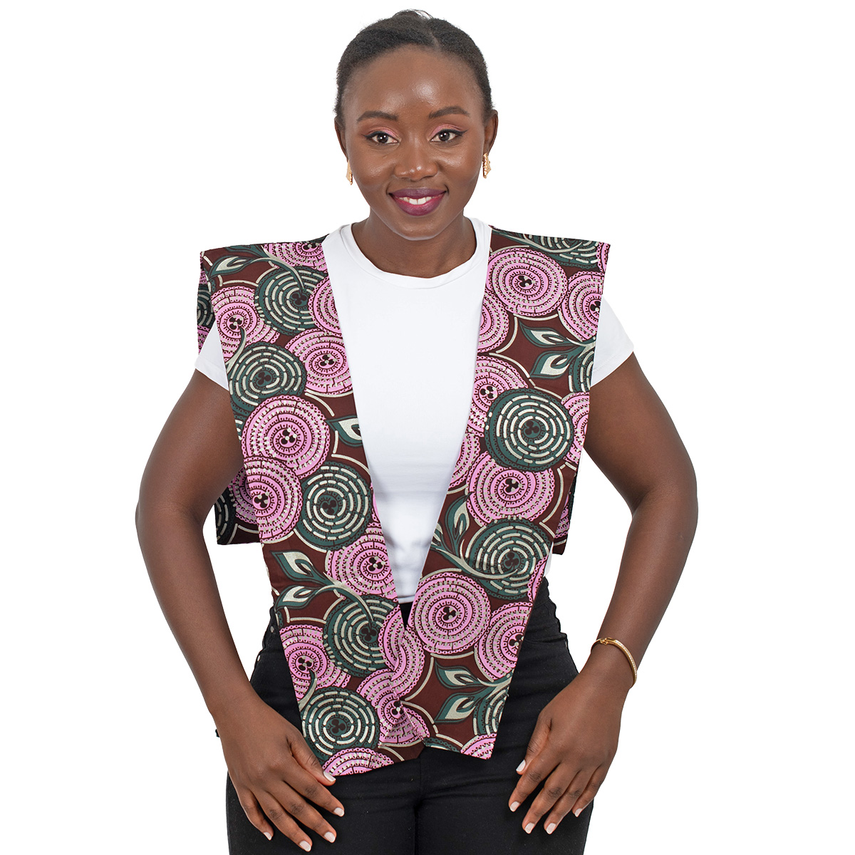 This shoulder cape is handcrafted from premium African wax print (Ankara) featuring the same distinctive circular pattern as the Violetta dungarees. The structured silhouette sits perfectly across the shoulders.